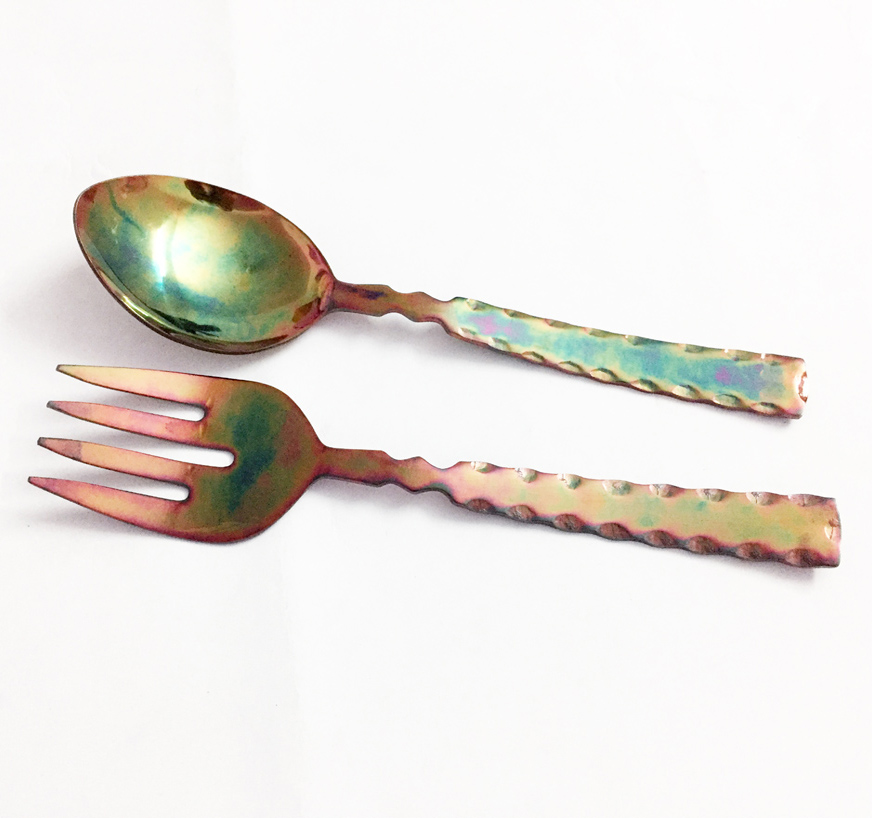 Our Salad Server is available as a set of 2 pieces. It is manufactured in 100% Stainless steel (14/4 grade) and has beveled edges. To increase the beauty of this products it has rainbow plating over its surface.
