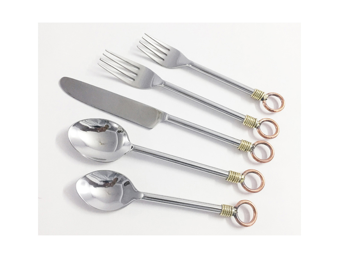 Our Ring Flatware is available as set of 5 pieces for single dining and in assortment of set of 16 pieces, set of 20 pieces etc depending on the requirement of our clients. This set is manufactured in Stainless steel (14/4 grade) with bras and copper decorative ring ends. It has fine polished finish.
